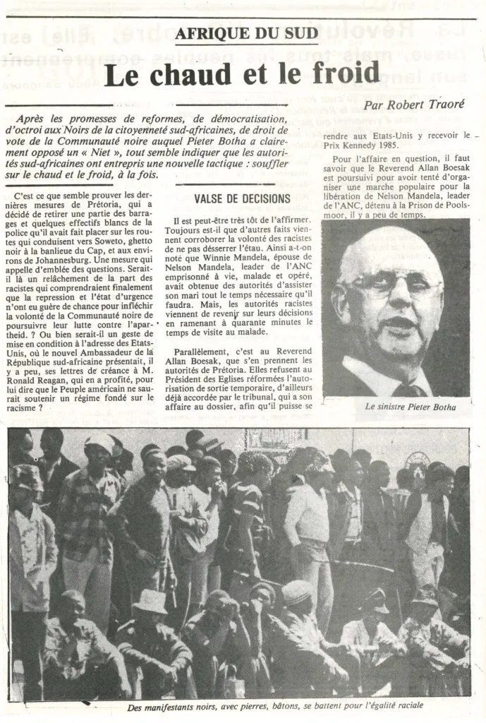 The most substantial engagement with the issue of apartheid can be found, unsurprisingly, in the material collected from other countries in Africa. The images below, found in information bulletins from Guinea and Senegal, give a snapshot of the debates around apartheid going on in these countries – the cartoons are especially striking in getting their message across.