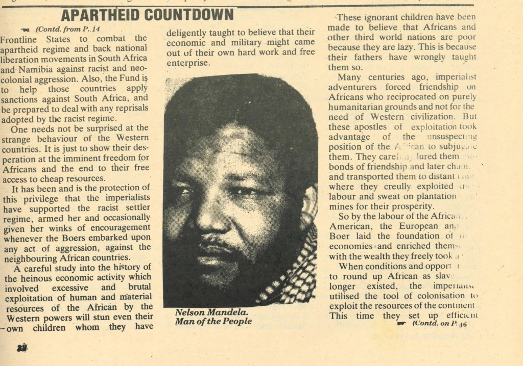In a similar way, the pages below, from a Ghanaian journal titled The Verdict, give us some insight into how apartheid was being discussed in Ghana, but also of how the issue was situated as being part of a wider ‘liberation front’ across Africa, with the idea of solidarity across this wider liberation struggle being an important theme. It is also worth noting that the article by Pius Yaokuma-Boateng specifically names the UK and American governments of Margaret Thatcher and Ronald Reagan as ‘the two most formidable opponents’ of the struggle for emancipation for South African blacks. In this way, we can see how material from collections like these can offer new, non-Western perspectives on major global events.