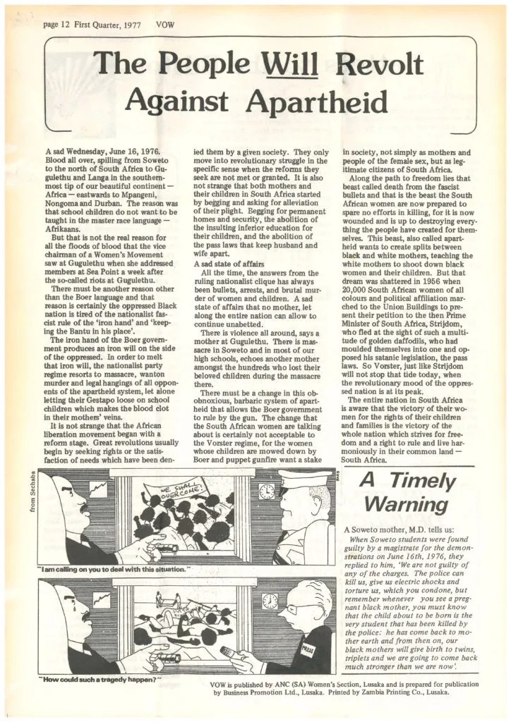 We have also included some images from a couple of the non-governmental publications we hold in the BLDS Legacy Collection. The first two images, a front and back page from the ANC-produced magazine Voice of Women are of obvious relevance here, giving a view of the apartheid regime not only from within South Africa, but specifically from the perspective of women living under the oppressive system of apartheid.