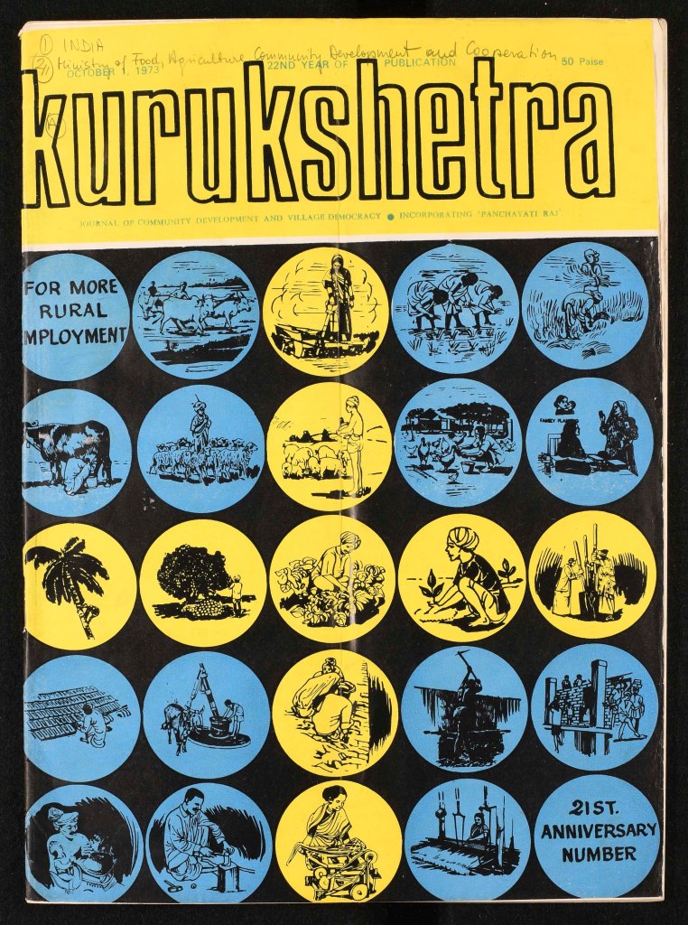 These intricate designs harp back to the traditional Indian block printing method as well as the more contemporary screen printing or lithographic techniques used across the globe in graphic design. Some of the later publications lean towards a graphic novel or comic book style. All the designs however use bright and bold colours and catch the reader’s eye immediately regardless of how the dry the content might be (yes, we know lots of you ARE interested in agricultural statistics!).