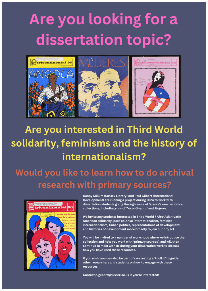 The BLDS Legacy team are delighted to announce that they have received funding from the University of Sussex Education and Innovation Fund for the project ‘Student Researchers in the BLDS Legacy Collection: Tricontinental, Mujeres, and the Worlds they Invite us to Imagine’.